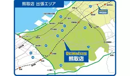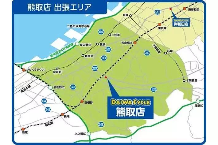 熊取店 出張修理エリア 地図上の濃い緑色の範囲が熊取店出張修理エリアとなっております。