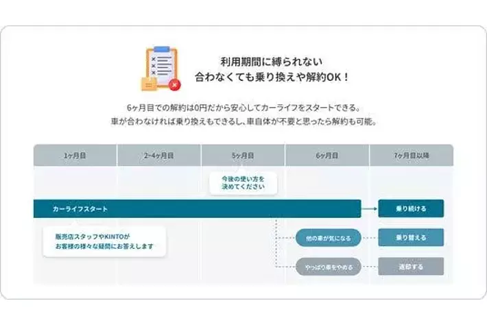 通常、初期費用フリープランの場合、契約期間の途中で解約をする際には、中途解約金が発生しますが、今回のキャンペーンでは、6カ月目の中途解約に限り、中途解約金を不要*²とします。まずは半年間クルマのある生活を体験していただき、そのうえで、ご自身にとって「クルマのタイプ(車種)が合っているか」、「クルマを乗り続けるか」をご判断いただけるため、気軽にクルマのある生活をスタートいただけます。