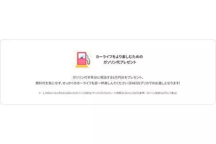 ガソリン代半年分に相当する5万円分*³のプリペイドカードをプレゼント。はじめてのクルマでも安心な安全性能を備え、ハイブリッド車ならではの優れた低燃費と爽快な走りが魅力の「ヤリスクロス」で、ガソリン代を気にせず、ぜひおでかけを楽しんでください。