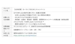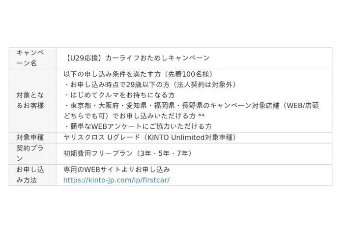 株式会社KINTO(以下、KINTO)は、「クルマは欲しいけど、あと一歩が踏み出せない」という若年のお客様に、気軽にクルマのある生活を始めていただくべく、29歳以下のお客様を対象とした【U29応援】カーライフおためしキャンペーンを先着100名様・地域限定で実施します。