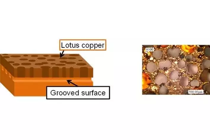 図1 グルーブ施工面に接合されたロータス銅(左)とロータス銅の表面写真(CC BY 4.0:https://doi.org/10.1016/j.applthermaleng.2025.126776)