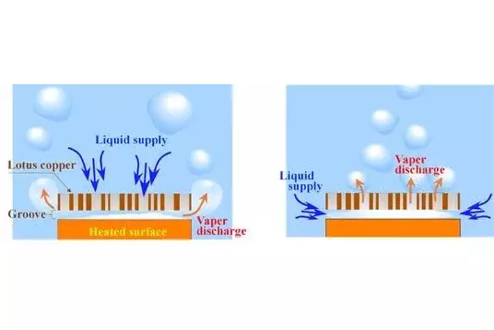 (a) Mode-G (b) Mode-L 図2 呼吸モード(左:グルーブから蒸気排出しロータス銅から液供給、右はその逆)(CC BY 4.0:https://doi.org/10.1016/j.applthermaleng.2025.126776)