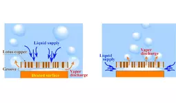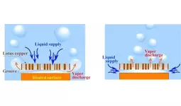 (a) Mode-G (b) Mode-L 図2 呼吸モード(左:グルーブから蒸気排出しロータス銅から液供給、右はその逆)(CC BY 4.0:https://doi.org/10.1016/j.applthermaleng.2025.126776)