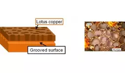 図1 グルーブ施工面に接合されたロータス銅(左)とロータス銅の表面写真(CC BY 4.0:https://doi.org/10.1016/j.applthermaleng.2025.126776)