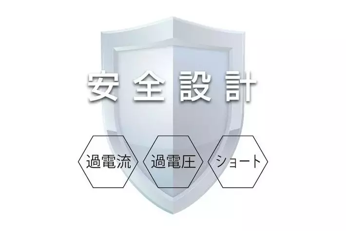 各種保護機能搭載の安心、安全設計保護機能の「過電流保護」「過電圧保護」「短絡(ショート)保護」を搭載し、高い安全性を備えています。過電流・過電圧・短絡(ショート)発生時に動作を止めることで、万が一の事故を未然に防ぎます。