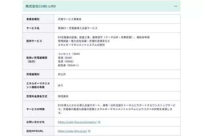 本ポータルの「充電サービス事業者紹介」ページに、CUBE-LINXの「商用EV・充電器導入支援サービス」が掲載されております。