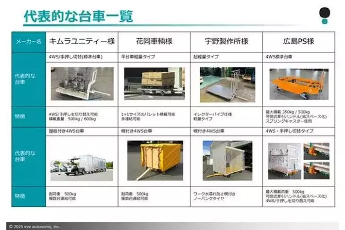 株式会社eve autonomy(イヴ・オートノミー、本社:静岡県磐田市、代表取締役CEO:星野 亮介、以下「eve autonomy」)は牽引台車の多様な導入実績とカスタマイズ事例をまとめた資料「牽引台車活用事例」の更新版を、本日より当社公式ウェブサイトにて無料公開いたしました。
