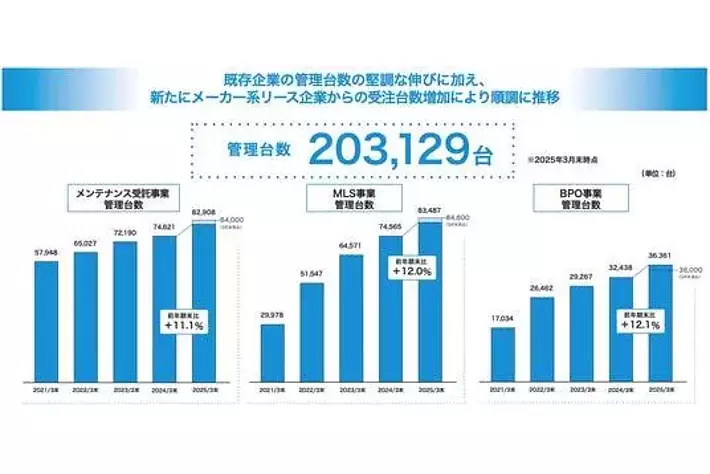 「メンテナンス受託事業」「MLS(マイカーリース)事業」「BPO事業」を主体として、当社が点検・整備等を含む包括的なサービスを提供する管理車両数は、本年3月末時点で20万3129台となりました。2021年3月末からの4年間で、約2倍に増加しています。これは、長年の取引先であるオートリース企業からの受託の堅調な伸びに加え、自動車メーカー系企業からの受注増加によるものです。
