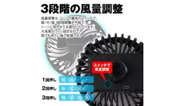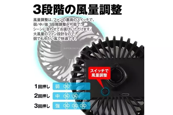 風量調整は、ファンの裏面のスイッチで、弱/中/強 3段階調整が可能で、シーンに合わせてお選びいただけます。大風量のファン設計なので、弱でも冷たい風で快適です。