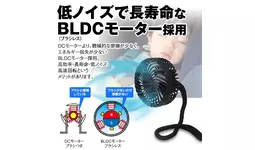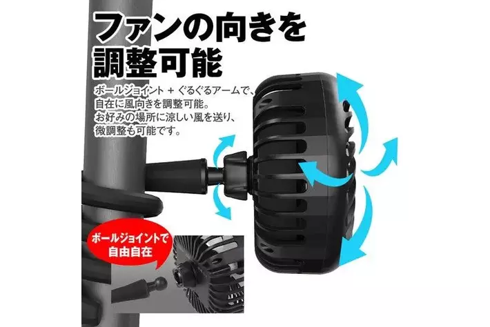ボールジョイント + ぐるぐるアームで、自在に風向きを調整可能。お好みの場所に涼しい風を送り、微調整も可能です。