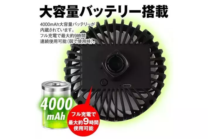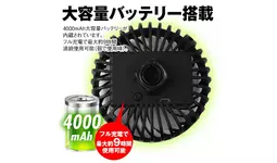 4000mAh大容量バッテリーが内蔵されています。フル充電で最大約9時間連続使用可能。(弱で使用時)