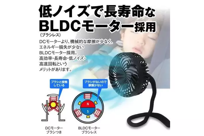 DCモーターより、機械的な摩擦が少なく、エネルギー損失が少ないBLDCモーター採用。高効率・長寿命・低ノイズ・高速回転というメリットがあります。