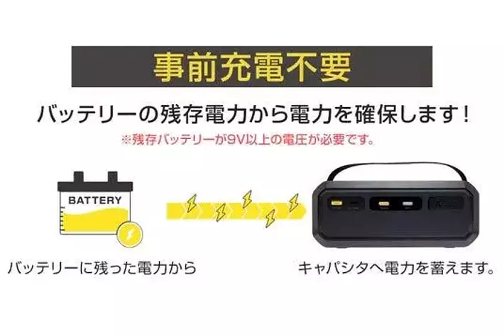 車に残っている電力を利用して、エンジンをスタートすることが可能になる電力を作り出すことが可能。事前充電が不要なので、急にバッテリーがあがっても問題ありません。