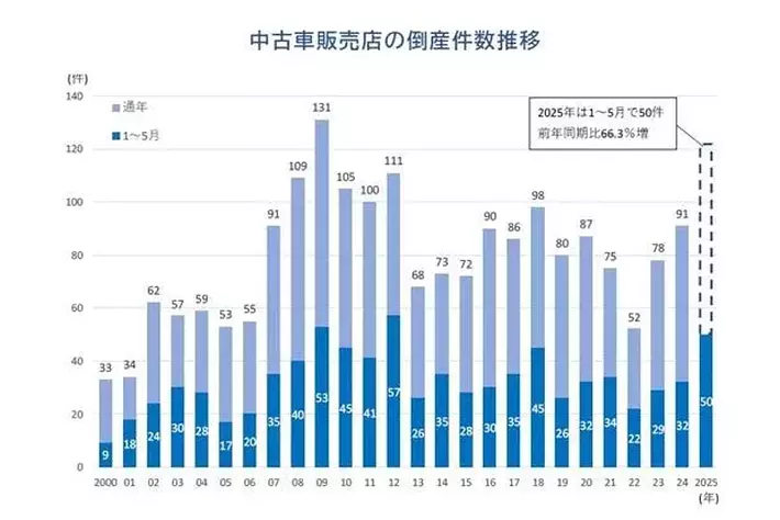 中古車販売店を経営する事業者の倒産が、過去最多に迫る勢いで増加している。2025年1~5月の倒産件数(負債1000万円以上、法的整理)は50件となり、前年同期(32件)と比べて56.3%と大幅に増加した。1月~5月の5カ月間で50件を超えるのは2012年以来13年ぶりとなり、年間発生件数が100件を超える可能性が高まっている。