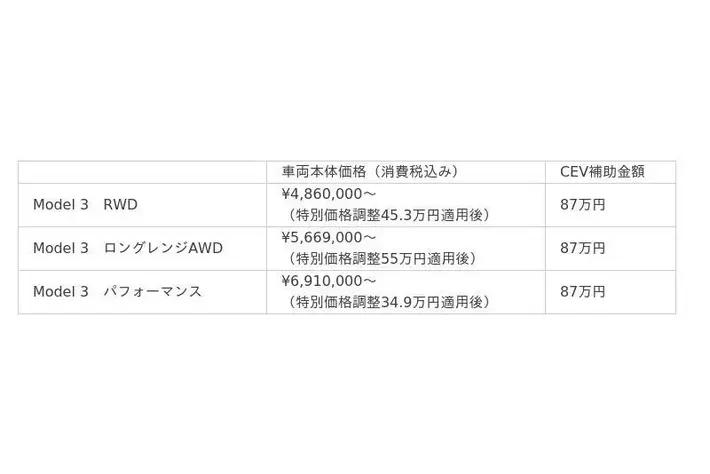 テスラは、より多くの方にテスラの魅力をご理解いただき、持続可能なエネルギーへの移行を加速させることを目指しています。このたび、Model 3の在庫車を6月30日までのご注文で、最大55万円(Model 3 RWD:45.3万円、Model 3 ロングレンジ:55万円、Model 3 パフォーマンス:34.9万円)特別価格調整を実施し、これまでよりもお求めやすい価格でご購入いただけるようになりました。令和7年度のCEV補助金と今回の特別価格調整を活用することで、Model 3はこれまで以上に価格競争力に優れた一台となり、より多くのお客様にとって魅力的な選択肢となります。