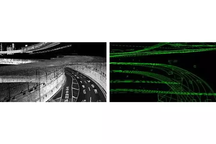 (左)高精度3次元点群データ (右)高精度3次元地図データ(HDマップ)