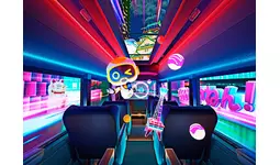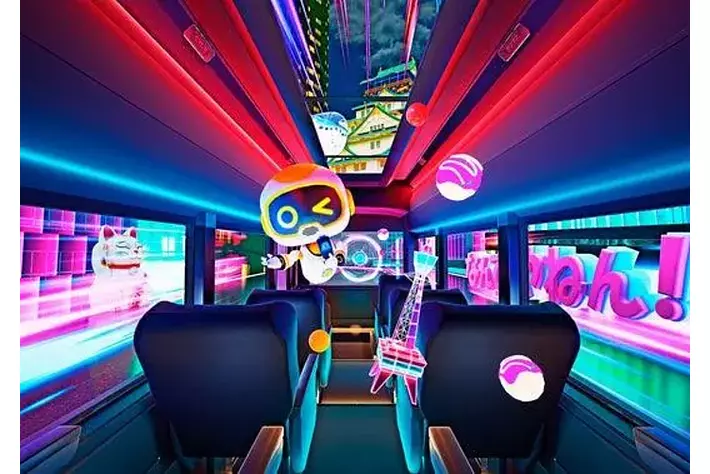 ツアーでご乗車いただくのは、東京のスタジオから遠隔で操作されるバーチャルバスガイドを搭載した、最先端のXRバスです。正面・左右に加えて天井もディスプレイとなっており、実際の風景にAR映像を重ねたダイナミックな視覚体験や、最新の音響設備による臨場感あふれる映像×音響演出がお楽しみいただけます。