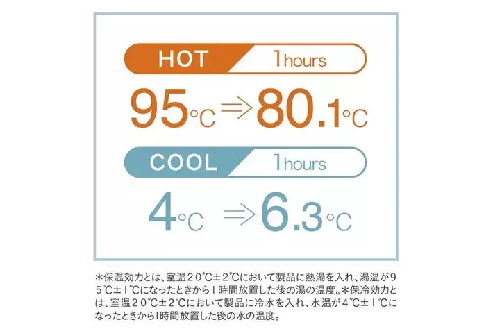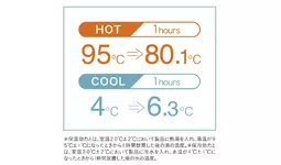 温かい飲み物は1時間後でも約80℃をキープ。冷たい飲み物も1時間後でしっかり冷たさを保ちます(※室温20℃前後の場合)。