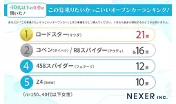 40代以下の女性では、可愛らしさと手軽さが魅力の「コペン」と、高級感漂う「R8スパイダー」が同率で2位にランクイン。50代以上の女性では、「911カブリオレ(ポルシェ)」が2位となり、憧れの高級車への関心がうかがえます。