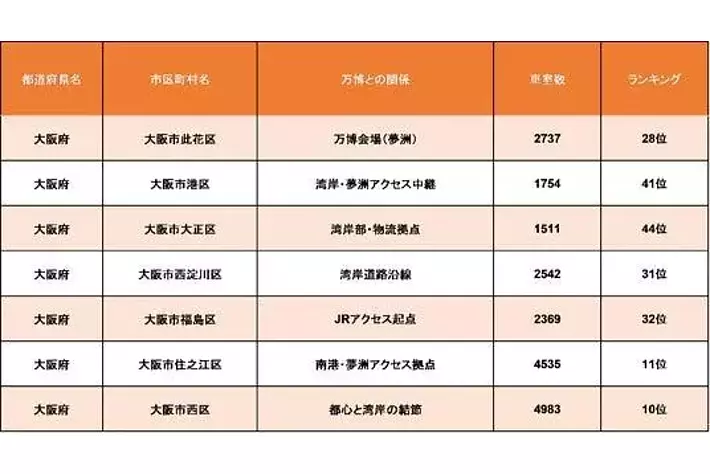 特筆すべきは、会場所在地である此花区が28位とTOP10圏外にとどまった点です。これは、万博来場者の多くが公共交通機関(ゆめ咲線・バス)での来場を促されているためと見られます。