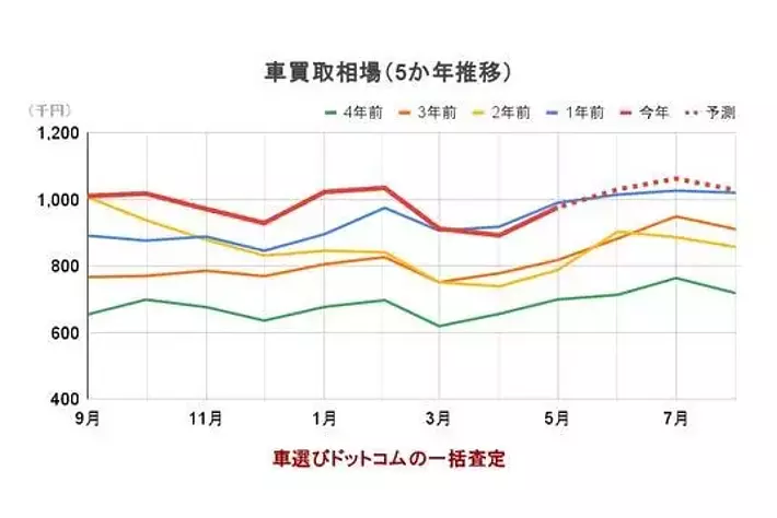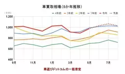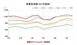 中古車買取相場は、4月時点で一度底を打ちましたが、その後も横ばいで推移していたため、車選びドットコムの統計データでは、回復の勢いは鈍化すると予測されていました。