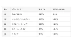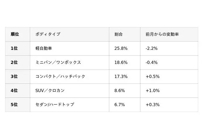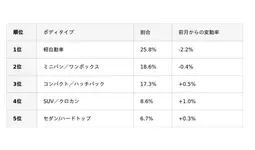 国産車ボディタイプ別買取ランキングは、軽自動車、ミニバン/ワンボックス、コンパクト/ハッチバック、SUV/クロカンが依然として人気が高く、続いて軽バン/軽ワゴンとセダン/ハードトップが5位の座を争っています。