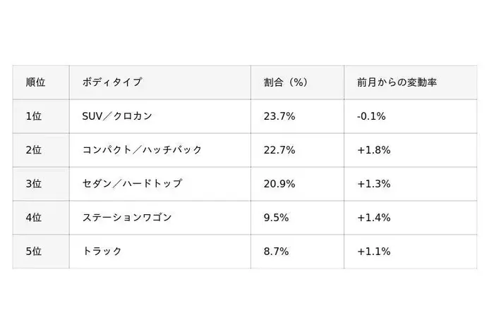 輸入車ボディタイプ別買取ランキングは、1位のSUV/クロカンから4位のステーションワゴンまでが前月と同様。5位のクーペがトラックに変わりました。