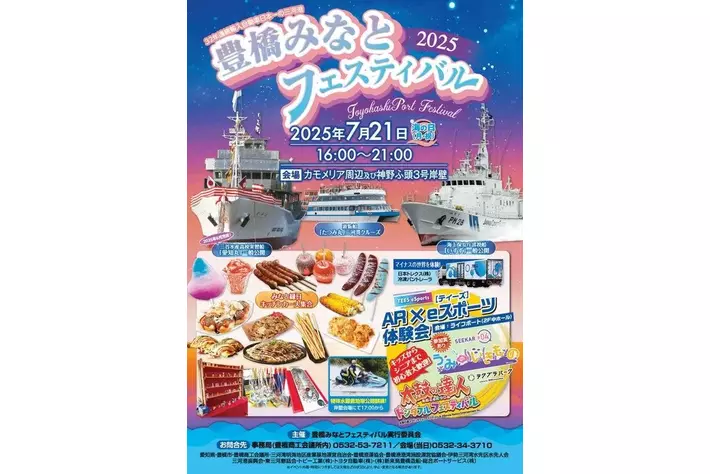 「海の日」である2025(令和7)年7月21日(月・祝)、国内屈指の自動車港湾、愛知・三河港の神野地区で恒例の「豊橋みなとフェスティバル2025」(実行委員会主催)が開催されます。大変暑い時期ですので、熱中症対策として今年も夕方から夜にかけて行われます。船舶の一般公開、三河港クルーズや縁日など多彩な催しが企画されています。海の日は、ぜひ豊橋の港へお越しください。