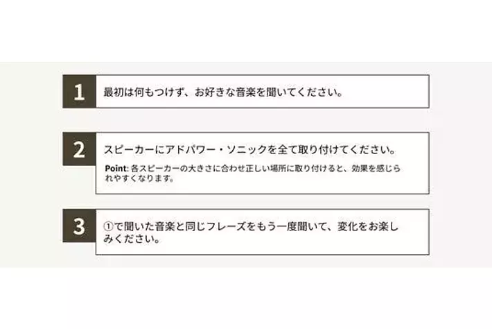 取り付け方は簡単で、シートをスピーカーに貼るだけ!以下の手順に沿って、取り付け前後の音楽の違いを聴き比べてください。