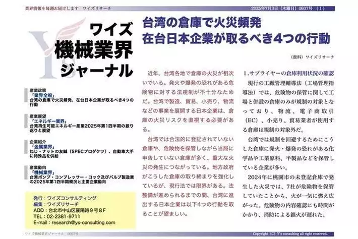 【台湾情報】台湾倉庫火災頻発、在台日本企業に迫るリスク管理強化<ワイズ機械業界ジャーナル2025年7月第1週号発行>