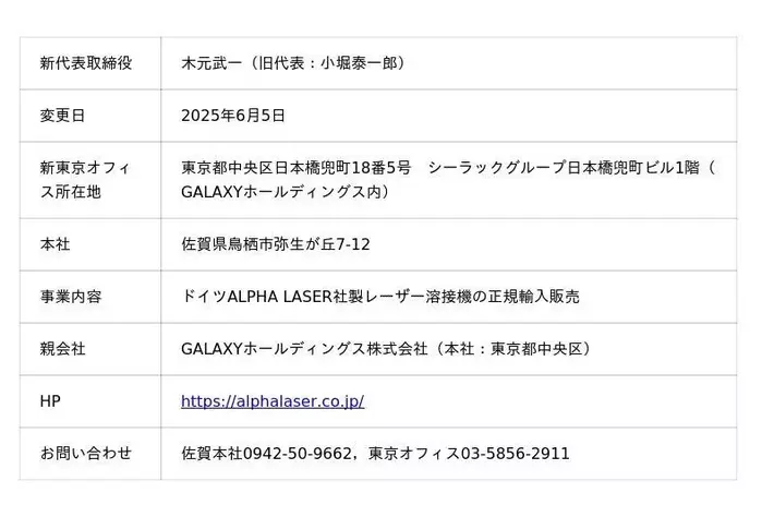 ALPHA LASER JAPAN株式会社、代表取締役交代およびGALAXYホールディングスグループに参画