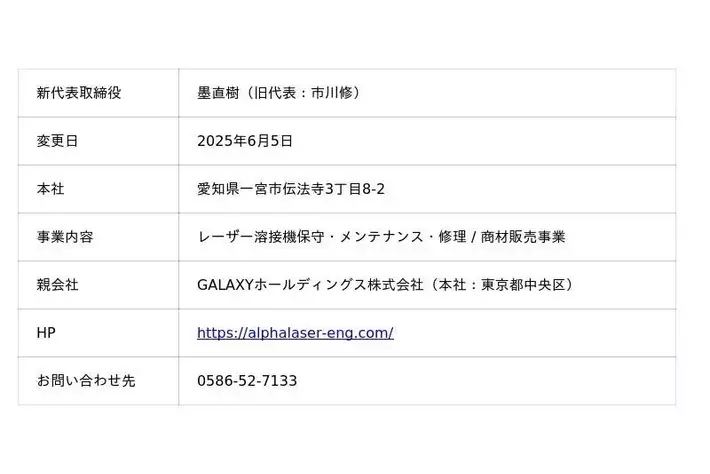 ALPHA LASER ENGINEERING株式会社、代表取締役交代およびGALAXYホールディングスグループに参画