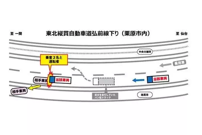 大型トラックが東北自動車道の第1車両通行帯を走行中、故障のため同通行帯に停車していた大型貸切バスと同バスの後方で故障対応していた運転者及び乗客2名に衝突した。この事故により大型貸切バスの運転者及び乗客2名が死亡し、大型トラックの運転者が重傷を負った。