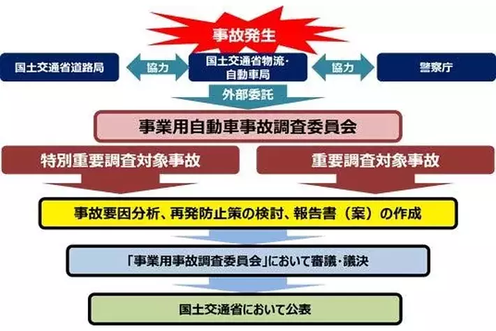 - 国土交通省は平成26年(2014年)6月、(公財)交通事故総合分析センターを事務局として、各分野の専門家から構成される「事業用自動車事故調査委員会」を設置し、事業用自動車の重大事故について事故要因の調査分析を行っている。