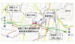 福岡・東京間を2名乗務で運行する大型乗合バスが、乗客17名を乗せて新東名高速道路の第3車両通行帯を走行中、同車両通行帯を左方にそれ、第2車両通行帯を走行していた大型トラックに追突した。この事故により、大型乗合バスの運転者及び乗客6名が軽傷を負った他、大型トラックの運転者が軽傷を負った。