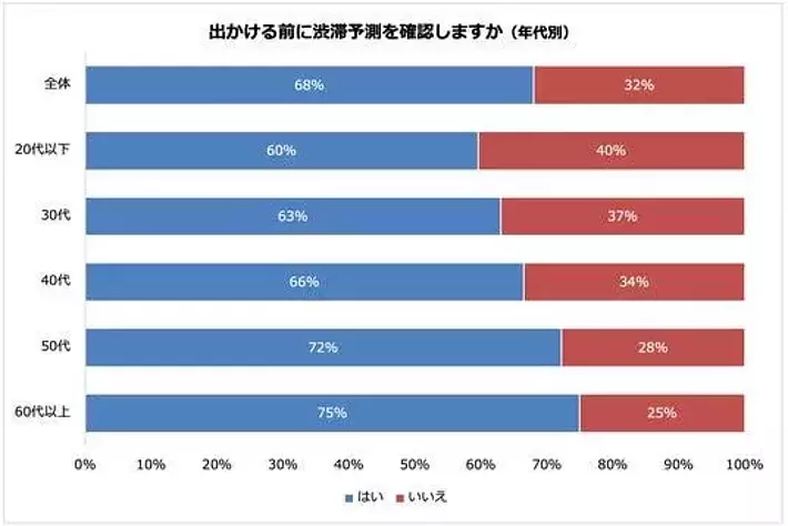 お出かけ前に渋滞予測を確認するドライバーは全体の68%でした。年代別に見ると、年代が上がるにつれて渋滞予測を確認する人が増え、20代以下と60代以上では15ポイントの差がつきました。年代が高い人ほど渋滞の有無を意識する人が多いようです。