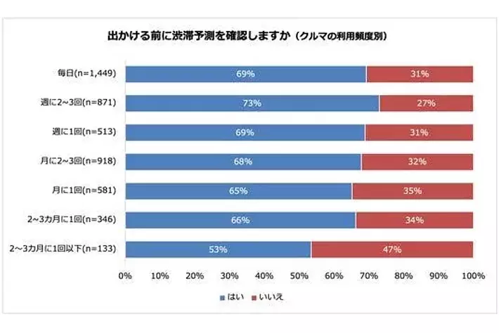 クルマの利用頻度別に見ると、利用頻度が「2~3カ月に1回以下」のみ、渋滞予測を確認する人が60%を下回りました。