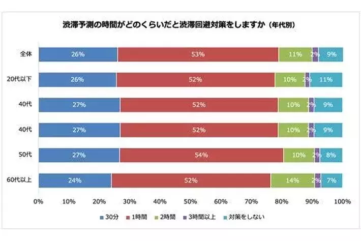 渋滞予測の時間がどのくらいであれば渋滞回避対策をするか尋ねると、「1時間」53%、「30分」26%、「2時間」11%の順に多くなりました。年代による大きな違いは見られず、どの年代も渋滞予測が「1時間」を超えると、半数が対策を講じることがわかりました。一方、渋滞予測の時間によらず、「渋滞対策をしない」と回答した人は全年代で10%程度にとどまりました。