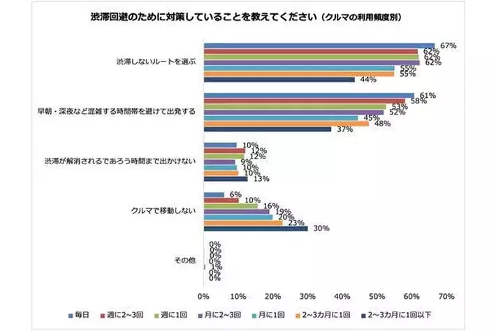 クルマの利用頻度別に見ると、「毎日」クルマを利用する人のみ「渋滞しないルートを選ぶ」と「早朝・深夜など混雑する時間帯を避けて出発する」の渋滞回避対策がいずれも6割以上になりました。また、クルマの利用頻度が低い人ほど、渋滞回避として「クルマで移動しない」を選択する割合が高い一方で、日常的にクルマをよく使う人は渋滞の有無に拘らずクルマで移動する傾向にあることがわかりました。
