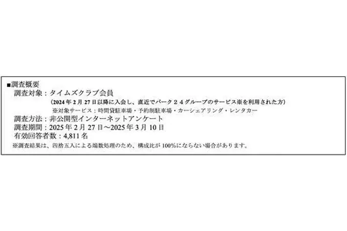 ※入会金・年会費無料の会員制ポイントプログラム。タイムズパーキングやタイムズカー、タイムズカーレンタルの利用等でポイントがたまる他、会員限定サービス等を提供。会員数1,234万人(2025年3月末現在)。なお、本アンケートは、駐車場やカーシェアリング、レンタカー等のクルマに関わるサービスを利用した方々を対象としたものです。