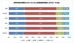渋滞予測の時間がどのくらいであれば渋滞回避対策をするか尋ねると、「1時間」53%、「30分」26%、「2時間」11%の順に多くなりました。年代による大きな違いは見られず、どの年代も渋滞予測が「1時間」を超えると、半数が対策を講じることがわかりました。一方、渋滞予測の時間によらず、「渋滞対策をしない」と回答した人は全年代で10%程度にとどまりました。