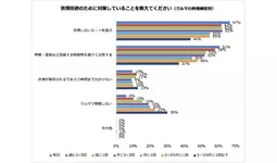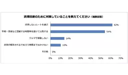 渋滞回避のための対策について尋ねたところ、1位は「渋滞しないルートを選ぶ」62%、2位は「早朝・深夜など混雑する時間帯を避けて出発する」54%となり、3位以下の「クルマで移動しない」14%と大きく差がつきました。