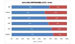 お出かけ前に渋滞予測を確認するドライバーは全体の68%でした。年代別に見ると、年代が上がるにつれて渋滞予測を確認する人が増え、20代以下と60代以上では15ポイントの差がつきました。年代が高い人ほど渋滞の有無を意識する人が多いようです。