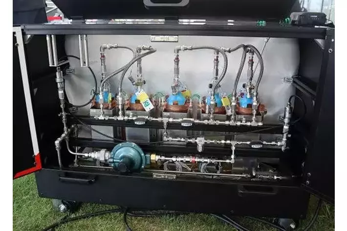 レストランONLY ONEの厨房に設置された水素グリラー実証機は、本社敷地内のCNラボで生成された水素を燃料として使用します。水素ボンベを運び、安定してガスを供給する専用台車を内製し活用することで、水素を「つくる」、「ためる」、「はこぶ」、「つかう」を達成し、水素の地産地消を実現しています。