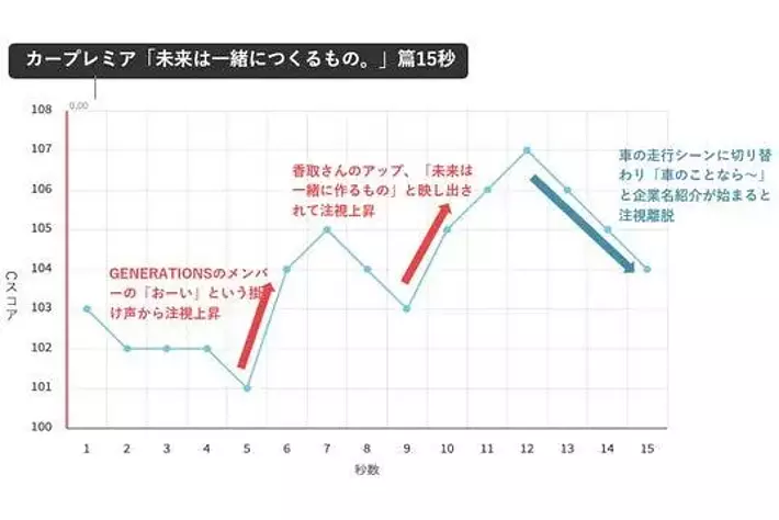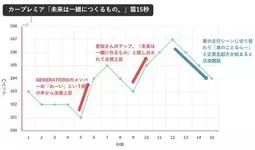 【10~12秒目】「未来は一緒につくるもの。」というメッセージの表示とともに、香取さんが「乗ってく?」と言い、GENERATIONS が「いくいく!」と答えるシーンで最も高いスコアを記録しています。
