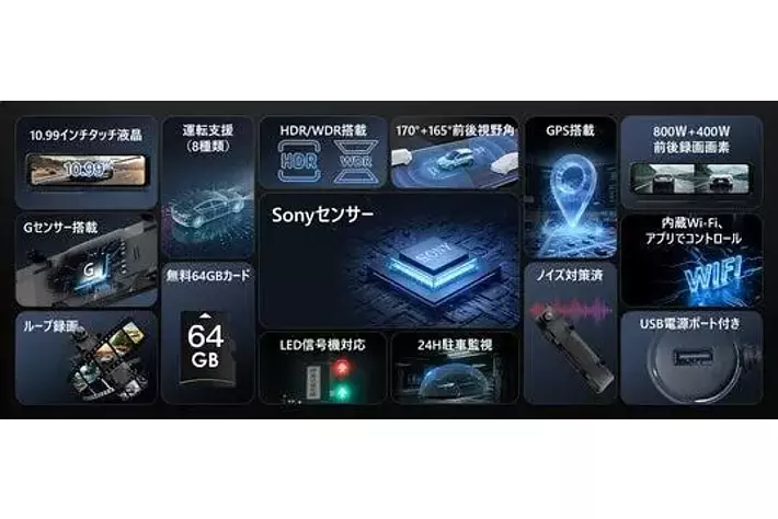 2025年7月11日、日本市場向けに4K前後録画対応のドライブレコーダー「K5」を発売予定です。このデバイスは、11インチのタッチスクリーンを搭載したデジタルミラー型で、前後のカメラは800万画素と400万画素で録画、Sony IMX335センサーとHDR/WDRナイトビジョン機能を備えています。また、8種類の運転支援機能を搭載し、無料の64GB SDカードが付属します。
