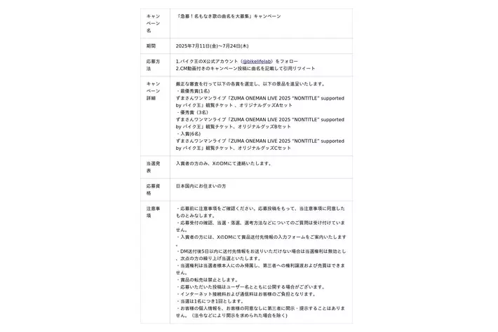 当キャンペーンは、当社新CMに登場いただいている、当社が協賛して2025年9月7日(日)に開催される、公式アンバサダーずまさんの自身初となるワンマンライブ、「ZUMA ONEMAN LIVE 2025 “NONTITLE” supported by バイク王」とのコラボ企画です。