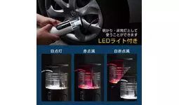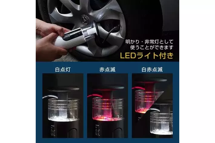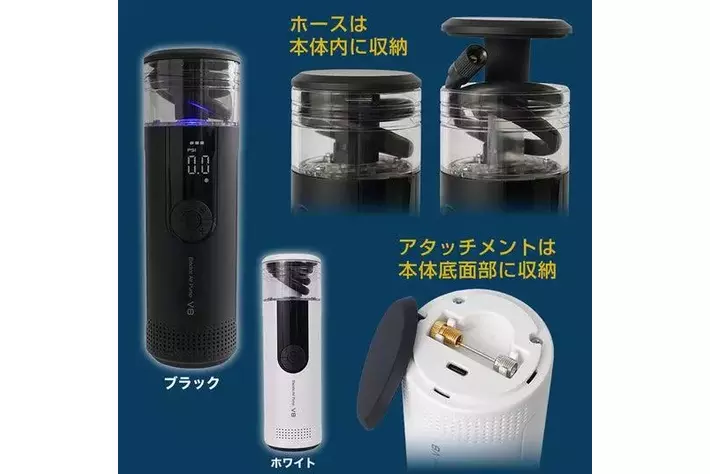 本製品は、車などのタイヤの空気入れや空気圧チェックに使える収納機能付きの充電式電動エアーポンプです。