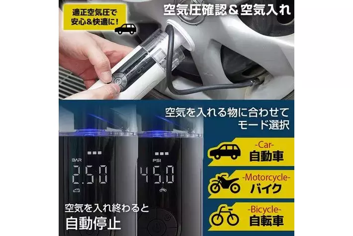 車・バイク・自転車・ボール・フリーのモードがあり、それぞれに適切な空気圧で設定されており、