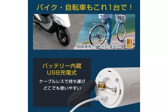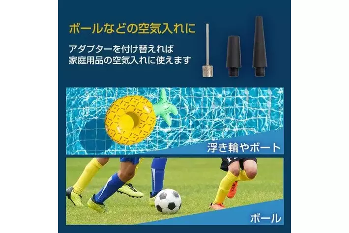 車、バイク、自転車のほか、浮き輪やボールにも対応したアダプター付きで、アウトドアやレジャーにも重宝します。